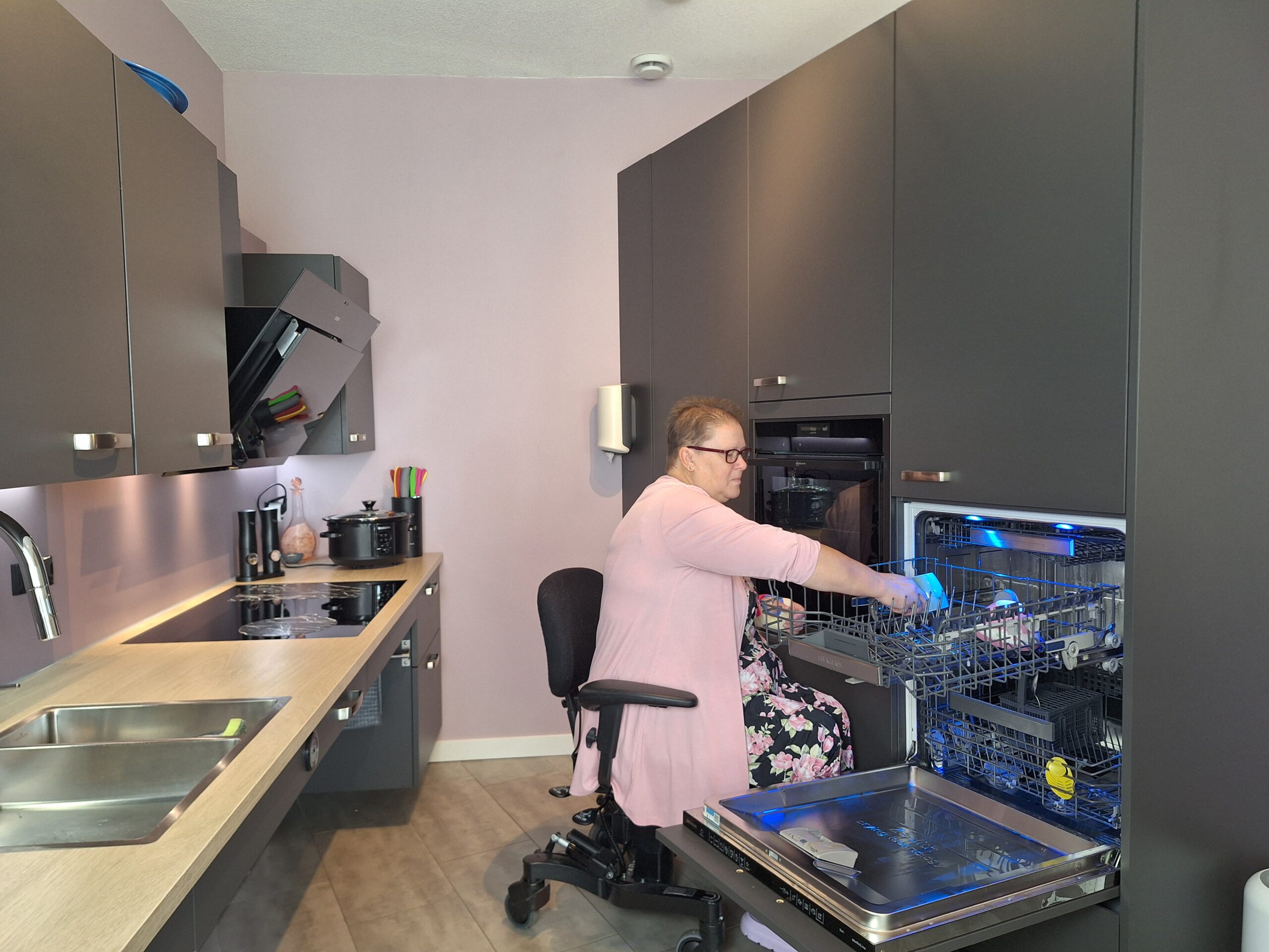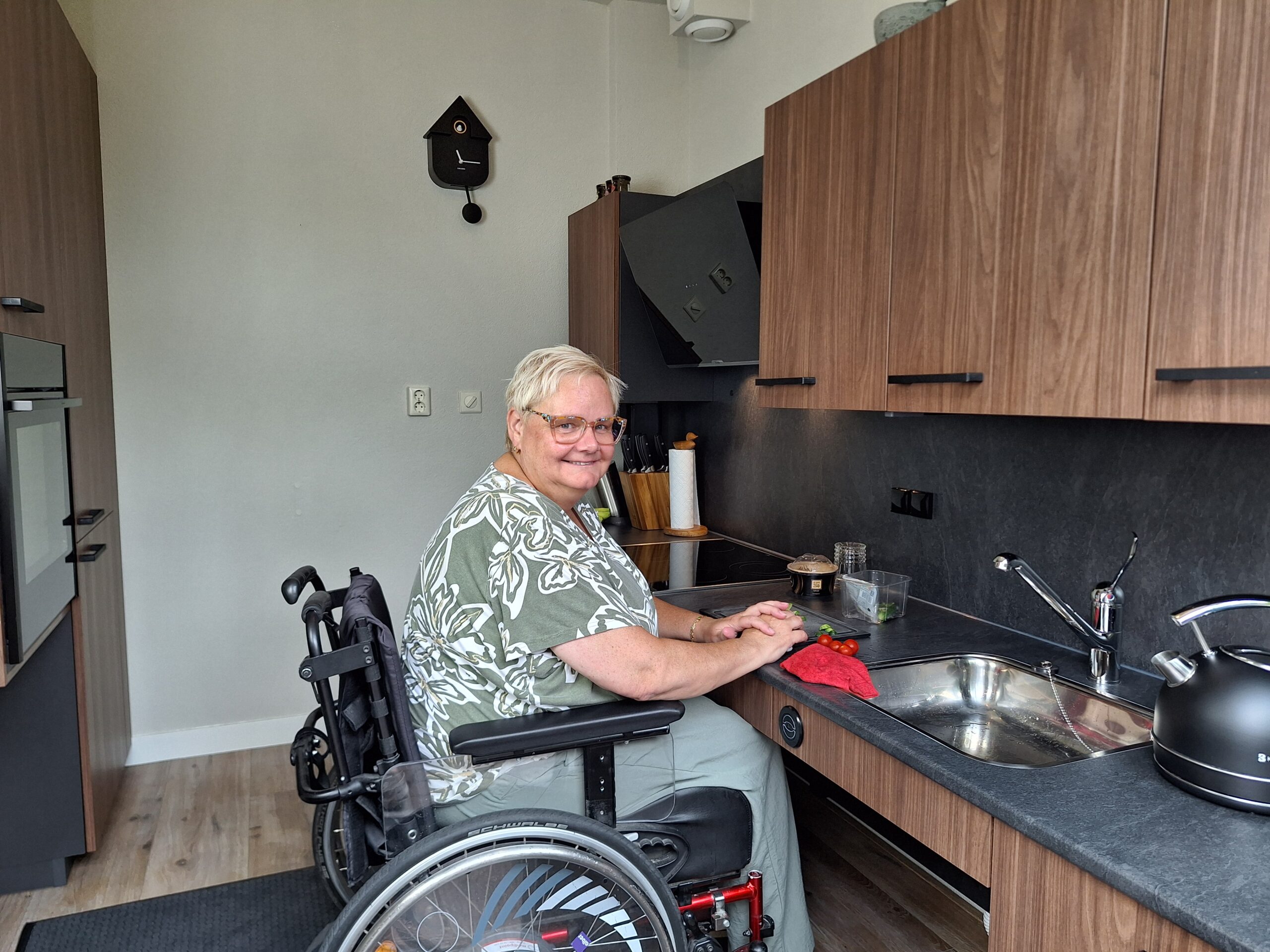 De oude keuken in het appartement van Wil van de Steeg was wel onderrijdbaar, maar niet verstelbaar. “Voor mij was hij te hoog, voor mijn man juist te laag. Daardoor kreeg ik al snel klachten als ik kookte,” vertelt Wil. Nu hebben ze een elektrisch verstelbare keuken, waardoor beiden comfortabel kunnen werken op hun eigen hoogte.
