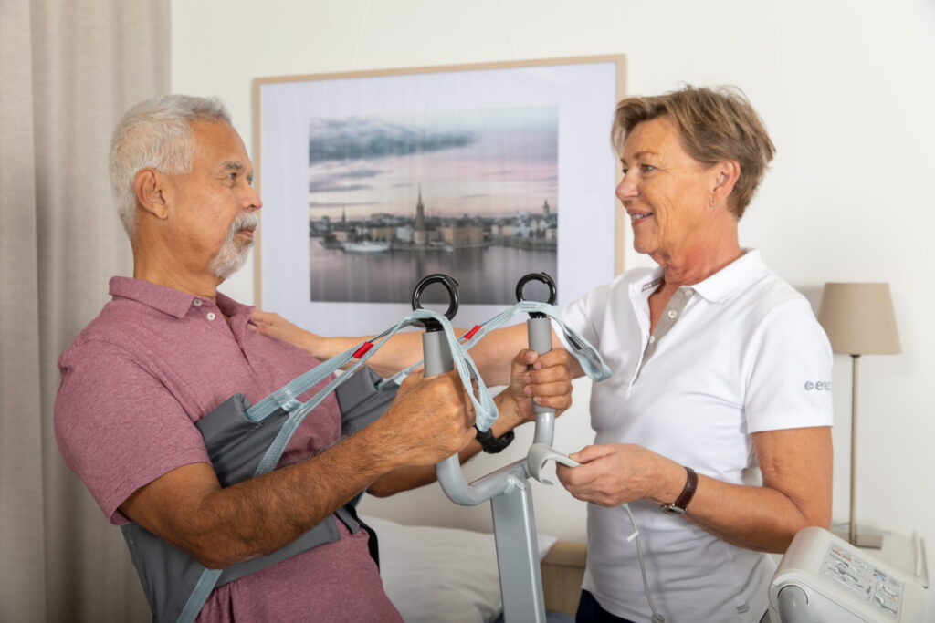 Het 4-punts tiljuk in combinatie met speciaal ontworpen tilbanden biedt optimale ondersteuning bij het opstaan. De schuine kolom volgt de natuurlijke beweging van de gebruiker, wat zorgt voor extra comfort en vertrouwen tijdens de transfer.